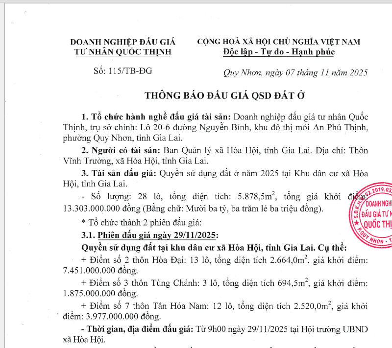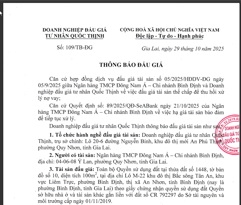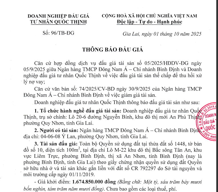 Doanh nghiệp đấu giá tư nhân Quốc Thịnh là một tổ chức đấu giá chuyên nghiệp đã được công nhận là Doanh nghiệp có đủ điều kiện hoạt động đấu giá do Bộ Tư pháp công bố hàng năm, có tên trong danh sách các tổ chức đấu giá trên địa bàn tỉnh Bình Định do Sở Tư pháp công bố.