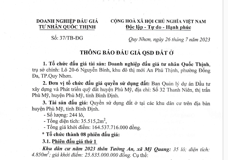 THÔNG BÁO ĐẤU GIÁ QSD ĐẤT Ở TẠI CÁC KHU DÂN CƯ TRÊN ĐỊA BÀN HUYỆN PHÙ MỸ, TỈNH BÌNH ĐỊNH