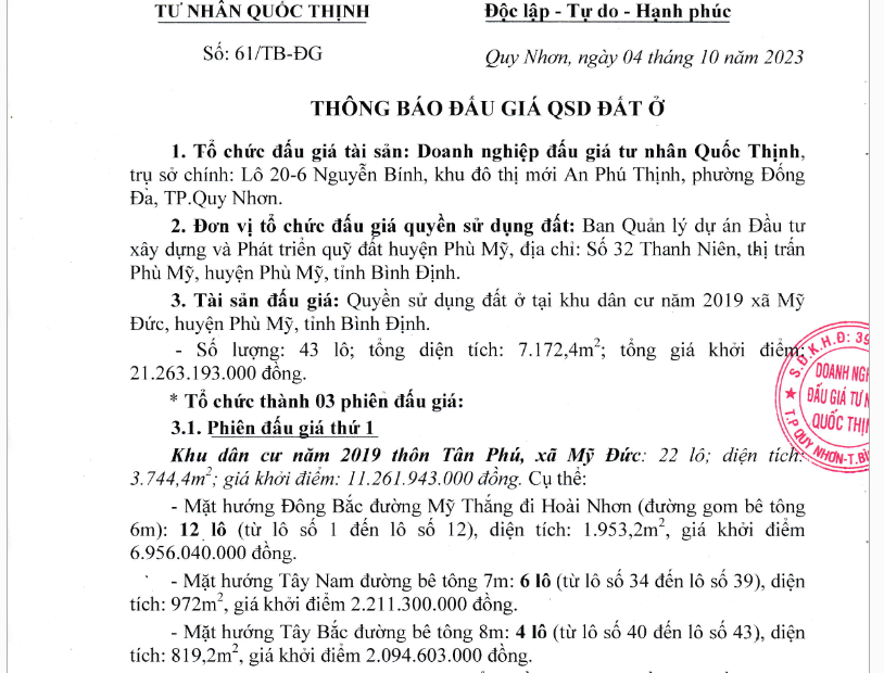 THÔNG BÁO ĐẤU GIÁ QSD ĐẤT Ở TẠI KHU DÂN CƯ NĂM 2022 THỊ TRẤN PHÙ MỸ, HUYỆN PHÙ MỸ, TỈNH BÌNH ĐỊNH.by admin