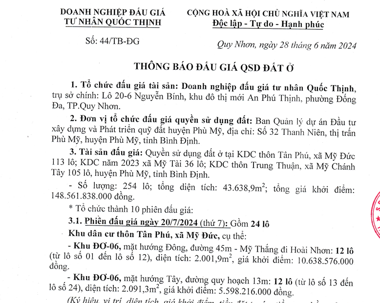 THÔNG BÁO ĐẤU GIÁ QSD ĐẤT Ở TẠI HUYỆN PHÙ MỸ, TỈNH BÌNH ĐỊNH